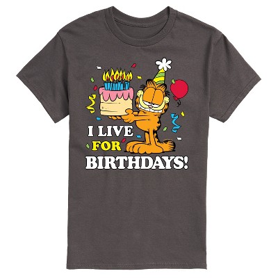 Garfield - I Live For Birthday's - Men's Short Sleeve Graphic T-Shirt - Bring the humor and laziness of the famous orange cat to your wardrobe with Garfield graphic apparel. Featuring Garfield, Odie, and Jon, these designs celebrate the iconic comic strip and its beloved characters.
