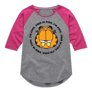 Garfield - I'm Fine This Is Fine - Toddler & Youth Girls Raglan Graphic T-Shirt - Bring the humor and laziness of the famous orange cat to your wardrobe with Garfield graphic apparel. Featuring Garfield, Odie, and Jon, these designs celebrate the iconic comic strip and its beloved characters.