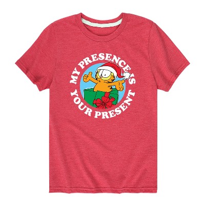 Garfield - My Presence Is Your Present - Toddler And Youth Long Sleeve Graphic T-Shirt - Bring the humor and laziness of the famous orange cat to your wardrobe with Garfield graphic apparel. Featuring Garfield, Odie, and Jon, these designs celebrate the iconic comic strip and its beloved characters.