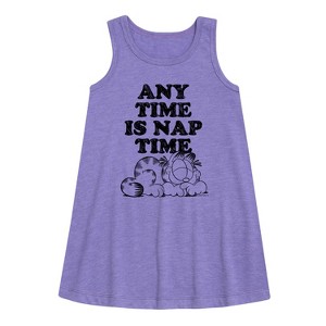 Garfield - Nap Sketch - Toddler & Youth Girls A-line Dress - Bring the humor and laziness of the famous orange cat to your wardrobe with Garfield graphic apparel. Featuring Garfield, Odie, and Jon, these designs celebrate the iconic comic strip and its beloved characters.