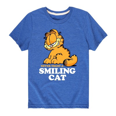 Garfield - Never Trust Smiling Cat - Toddler And Youth Short Sleeve Graphic T-Shirt - Bring the humor and laziness of the famous orange cat to your wardrobe with Garfield graphic apparel. Featuring Garfield, Odie, and Jon, these designs celebrate the iconic comic strip and its beloved characters.