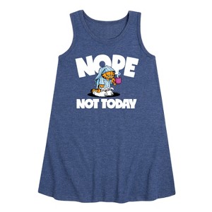 Garfield - Nope Not Today - Toddler & Youth Girls A-line Dress - Bring the humor and laziness of the famous orange cat to your wardrobe with Garfield graphic apparel. Featuring Garfield, Odie, and Jon, these designs celebrate the iconic comic strip and its beloved characters.