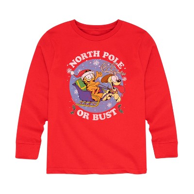 Garfield - North Pole Or Bust - Toddler And Youth Short Sleeve Graphic T-Shirt - Bring the humor and laziness of the famous orange cat to your wardrobe with Garfield graphic apparel. Featuring Garfield, Odie, and Jon, these designs celebrate the iconic comic strip and its beloved characters.