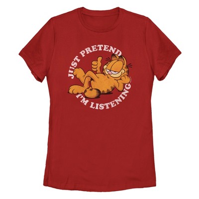 Garfield - Pretend I'm Listening - Men's Short Sleeve Graphic T-Shirt - Bring the humor and laziness of the famous orange cat to your wardrobe with Garfield graphic apparel. Featuring Garfield, Odie, and Jon, these designs celebrate the iconic comic strip and its beloved characters.
