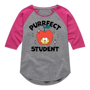Garfield - Purrfect Student - Toddler & Youth Girls Raglan Graphic T-Shirt - Bring the humor and laziness of the famous orange cat to your wardrobe with Garfield graphic apparel. Featuring Garfield, Odie, and Jon, these designs celebrate the iconic comic strip and its beloved characters.