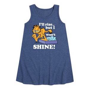 Garfield - Rise But Won't Shine - Toddler and Youth Girls A-line Dress - Bring the humor and laziness of the famous orange cat to your wardrobe with Garfield graphic apparel. Featuring Garfield, Odie, and Jon, these designs celebrate the iconic comic strip and its beloved characters.