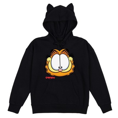 Celebrate your favorite feline with this women's black Garfield long sleeve hooded sweatshirt. Featuring an image of Garfiled's smiling face on the front and 3D cat ears on the hood, this sweatshirt offers an immersive fan experience. Crafted from a cozy cotton-polyester blend, this hoodie offers comfort and durability. The adjustable hood provides a versatile fit. For simple maintenance, machine wash this hoodie on cold with like colors and tumble dry on low heat.