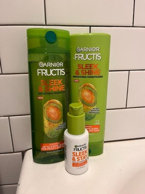 - Garnier Fructis Sleek & Shine Shampoo: With fairly & sustainably sourced Argan Oil from Morocco soaks into frizzy, dry hair to smooth each strand. Long lasting frizz control even in 97% humidity