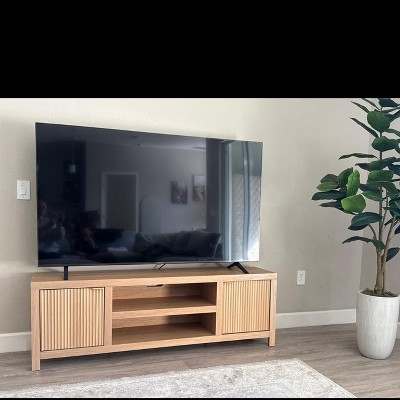 CHIC DESIGN: This TV stand combines a wooden entertainment center with fluted doors, bringing modern style to your space. The media cabinet features fluted doors with gold handles, simple lines, and natural tones
