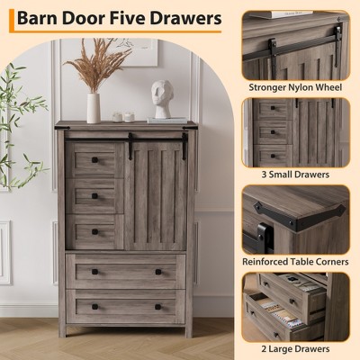 GarveeHome Farmhouse 5-Drawer Dresser, 48" Tall Wood Chest with Sliding Barn Door & Adjustable Shelf, Storage Organizer, Grey