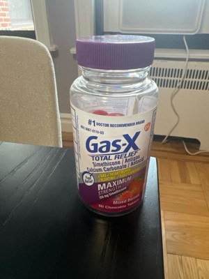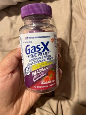 Gas-X Total Relief Chewable Tablets deliver fast relief of gas pressure, bloating, discomfort and heartburn relief to help you take back control and confidence. These gas and heartburn chews offer a multi-benefit solution in a new enjoyable form to meet all your gas and heartburn relief needs. Gas-X Total Relief chewable tablets use 250 mg of simethicone per tablet (Maximum Strength) to break up gas bubbles in your stomach and intestines for fast gas and bloating relief. This product also contains 750 mg of calcium carbonate per tablet (Extra Strength) for heartburn relief. Gas-X Total Relief chews offer gas relief and heartburn relief in a delicious mixed berry flavor. Adults and children 12 years of age and older may take one or two gas and heartburn relief tablets as needed, not to exceed two chewable tablets in 24 hours unless directed by a doctor. Trust Gas-X, the number 1 doctor recommended gas relief brand.