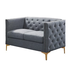 You'll enjoy the best in traditional and contemporary design with the Vern Upholstered loveseat by miBasics. The traditional Chesterfield inspired shape with its high armrests is highlighted with nailhead trim. Deep button tufted fabric in a rich coloration adds a classic look and feel to this appealing design. Modern style metal feet add a contemporary flair with their delicate look and rich, aged finish. Pocket coil cushions keep you comfortable and supported while reading the paper or catching up with the latest on your tablet.