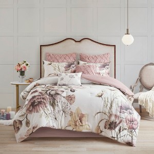 This 8-piece modern floral comforter set adds a chic touch to your bedroom with bold, large-scale prints in soft blush hues for a stylish update. The set includes a comforter, two shams, two euro shams, two decorative pillows, and a bed skirt for a fully coordinated look. Tufted and embroidered accent pillows add elegant texture, while the lightweight cotton fabric and hypoallergenic filling ensure breathable comfort year-round. Machine washable and OEKO-TEX certified, this set is easy to care for and safe for healthy, restful sleep.