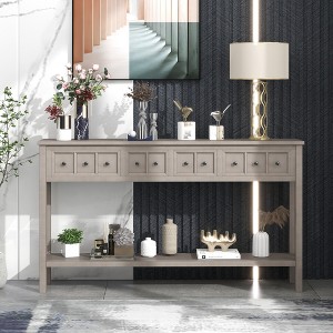 Add timeless charm and practical storage to your home with the Rustic Entryway Console Table. Measuring 60" long, this slender yet sturdy table features a solid wood frame with a distressed finish. Designed with two small drawers, two large drawers, and a bottom shelf, it offers versatile storage for essentials while showcasing décor. Perfect for entryways, living rooms, or hallways, its sleek design maximizes space without sacrificing style. Quick to assemble, this piece blends elegance, durability, and functionality for everyday use.