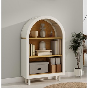 Add timeless charm and functional style to your home with this elegant arched top storage shelf. Designed to be more than just storage, the signature arched silhouette brings a classic, sophisticated touch that instantly elevates any space—from living rooms and bedrooms to dining areas and entryways. The stylish two-tone finish pairs a crisp white painted frame with warm, natural wood grain laminate shelves and back panel, offering a beautiful blend of modern elegance and rustic appeal that fits effortlessly with a variety of décor styles. With three spacious open tiers measuring approximately 23.6" wide by 9.5" deep, this unit provides generous room for displaying books, cherished décor, plants, or organizing everyday essentials like dinnerware, toys, or accessories. Solid wood legs in a matching white finish add a refined detail, while also offering enhanced stability and a light, airy feel with added bottom clearance for easy cleaning. Sized at about 23.6" wide by 9.5" deep by 37.4" high, this versatile piece fits seamlessly into any corner of your home whether you use it as a stylish bookshelf, a practical bedside companion, or a welcoming entryway organizer.