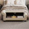 Add both style and function to your home with this elegant bed bench. Featuring a modern design with a tufted velvet surface and antique copper nailhead trim, this piece brings a classic charm to any bedroom or living space. The versatile silhouette includes a high backrest on one end, allowing it to double as a comfortable recliner sofa. Crafted with soft velvet upholstery, this bench is smooth to the touch and adds a luxurious feel to your décor. The sturdy brown solid wood legs ensure lasting durability and support up to 400 pounds. It also offers a generous hidden storage compartment, perfect for tucking away blankets, clothes, or extra pillows measuring 45.2 by 15.3 by 7.5 inches. Assembly is quick and easy, with the armrests pre-fitted with metal inserts for secure attachment and wooden legs that can be hand-screwed into place. Whether placed at the foot of your bed or used as a chic accent piece in your living room, this bench blends comfort, practicality, and timeless design.