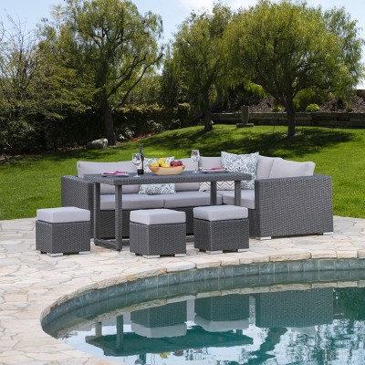 Everything you need and more for enjoying your patio, backyard, or garden, this versatile outdoor dining sofa set allows you to entertain or dine in style and ultimate comfort. Made with a stunning wicker finish and topped with water resistant cushions, this set is designed bring your outdoor space impressive aesthetics and functionality.