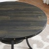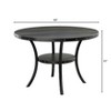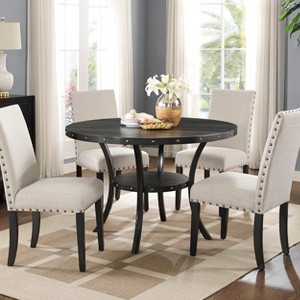 This contemporary round dining table combines modern design with functional storage to enhance your dining space. The Coffee Bean finish tabletop is accented with stylish brass nail-head details, creating a refined focal point. Sturdy metal legs and framework provide dependable support, while the open shelf underneath adds convenient storage for everyday essentials. Sized at 48 inches in diameter, it offers comfortable seating for meals and gatherings. Easy to assemble and versatile in style, this table is a practical and elegant addition to any home.