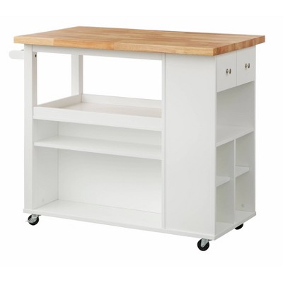 GDFStudio Callie Two-Tier Kitchen Island Table with Rubber Wood Top, Storage Cabinets and Pull-Out Drawers