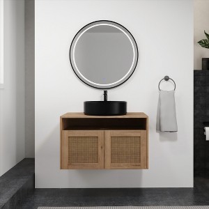 - Wall-Mounted Modern Design: Featuring a floating, wall-mounted design, this vanity enhances bathroom space with a minimalist aesthetic. The natural rattan doors paired with an imitative oak finish introduce a refreshing and elegant atmosphere.