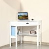 This modern corner desk combines style and function with a sleek triangular design that fits perfectly in small spaces. Its space-saving layout makes the most of unused corners while enhancing room aesthetics. Featuring ample storage, the desk includes a slide-out drawer and two open shelves, keeping books, supplies, and essentials neatly organized. Versatile in use, it works as a computer desk, writing station, or display stand for photos, plants, or décor. Perfect for apartments or home offices, it offers practical functionality with contemporary appeal.