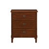 The nightstand blends rustic elegance with everyday functionality. Crafted from acacia veneer, poplar solids, and MDF, it showcases refined details like picture frame molding and antique bronze ring pulls for a timeless look. Three drawers with tea-stained interiors provide ample storage, while full-extension metal glides ensure smooth operation. Designed to complement a range of interiors, this nightstand brings both charm and convenience to your space.