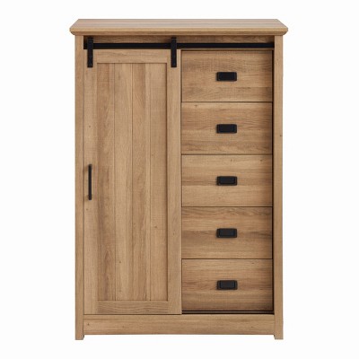 GDFStudio Isador Farmhouse 5-Drawer Wood Dresser with Sliding Barn Door, White