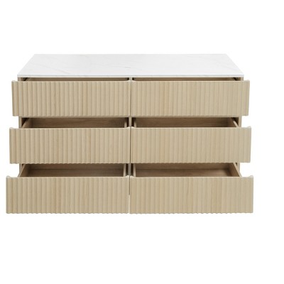 Add warmth and structure to your space with the Kerr 6-drawer dresser. Featuring a modern geometric pattern across the drawer fronts and a rich natural wood finish, this piece brings both texture and elegance to any room. Six spacious drawers offer ample storage for clothing, accessories, or household items, while metal drawer slides ensure smooth operation. The sturdy solid wood frame and sculptural base provide stability with a contemporary edge. Ideal for bedrooms, entryways, or living rooms, this dresser blends function with timeless design.