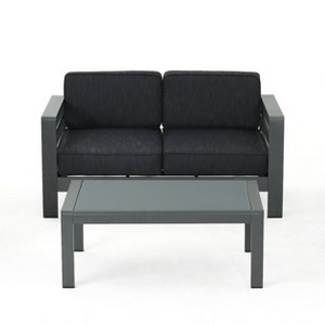 GDFStudio Liam Outdoor Aluminum Loveseat and Coffee Table Set with Cushions, Gray/Dark Gray