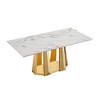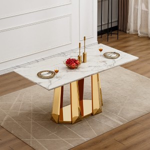 This modern rectangular dining table features a sleek silhouette and polished lines that elevate any space with contemporary elegance. Its faux marble tabletop offers a luxurious stone-like appearance with realistic veining, while being scratch-resistant and easy to clean. The mirrored chrome-plated stainless steel base adds a glamorous touch and ensures long-lasting stability. Designed for versatility, it serves as a stylish centerpiece for dining, meetings, or displays in both home and professional settings. Ideal for modern interiors, it seamlessly blends function and style for a refined, everyday dining experience.