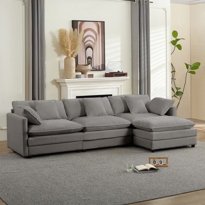 GDFStudio Moore Modern Wood and Corduroy Upholstered 4-Seat L-Shaped Sectional Sofa with Pull-Out Storage, Ottoman and Pillows