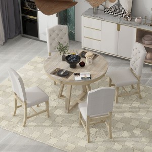 Add classic retro charm and versatility to your dining space with this 5-piece dining set. Featuring a round table with a 16" removable leaf, it easily transforms into an oval to seat more guests. The table showcases sturdy cross-shaped legs and a durable wood veneer finish for timeless appeal. Four upholstered chairs with tufted backs and flared legs provide both comfort and elegance. Built with a solid rubber wood frame, engineered wood, and LVL construction, this set ensures durability, stability, and long-lasting use for everyday dining or gatherings.