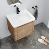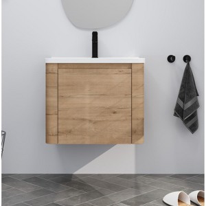 Upgrade your bathroom with this wall-mounted vanity available in two configurations: with or without storage shelves. The premium ceramic sink features a smooth, easy-clean surface and built-in overflow, while the soft-close door ensures quiet operation. Made from durable plywood with a scratch- and water-resistant melamine finish, it withstands humid environments. The floating design saves space, and the eco-friendly board reduces environmental impact. Optional open storage shelves provide extra organization for towels, toiletries, or décor, keeping your bathroom tidy and stylish.