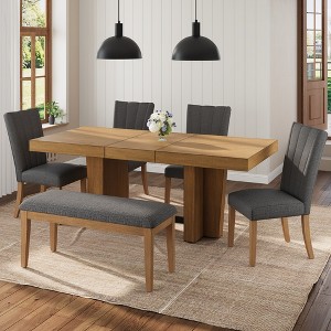 Upgrade your dining experience with this 6-piece modern dining set featuring a versatile extendable table. The table easily expands from 60.1" to 78.1" with a removable 18" leaf, providing extra space for larger gatherings. Built from solid rubber wood, the table includes a thick 3.8" top and sturdy trestle legs for lasting durability. Four upholstered chairs with soft, 5.5" thick cushions and a matching padded bench offer exceptional comfort and seating flexibility. Smooth slide rails make extending the table effortless, while adjustable foot pads keep everything stable on uneven floors. Designed for both function and style, this set is ideal for family meals, holidays, or casual get-togethers. The clean lines, neutral tones, and high-quality wood construction make it a perfect fit for any modern or transitional dining room. Assembly required. Ships in three boxes.
