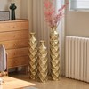 Infuse your home with opulent style using this set of three glamorous gold metal vases. Expertly crafted from pure metal, each piece features a captivating blend of polished and hammered gold finishes alongside intricate embossed geometric patterns. Their tall, slender cylinder shapes create a modern and powerful visual impact, perfect for crafting stunning centerpieces with dry branches or silk florals.