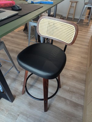 Elevate your seating experience with the GDFStudio Sean 25.59" Swivel Bar Stool Set. Each stool features a breathable rattan cane back that encourages airflow, keeping you cool while offering ergonomic support. The padded faux leather seat is thick and supportive, perfect for long meals or casual conversations. With a full 360° swivel base, these stools adapt easily to dynamic spaces like kitchen counters, bar areas, and breakfast nooks. The solid walnut-finished wooden legs provide a grounded, elegant base that pairs beautifully with a range of decor styles. Designed to support up to 330 lbs, this set blends style and strength with ease. Assembly is simple, with all necessary hardware and easy-to-follow instructions included. Whether you're upgrading your home bar or enhancing your kitchen island, the Sean Bar Stool Set delivers comfort, durability, and timeless design in one smart package.