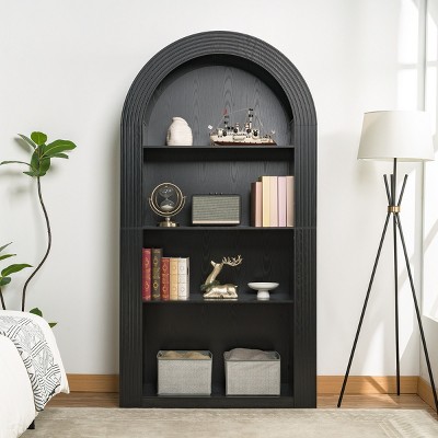 Enhance your living or work space with this 79" modern bookcase cabinet, featuring a blend of open and hidden storage. Four spacious open shelves display books, plants, or décor, while soft-close doors reveal two adjustable shelves for organized storage. Crafted with a clean handle-free design and integrated cutouts, it offers a sleek, minimalist appearance. The rich wood grain texture brings warmth and sophistication to any room. Perfect for offices, living rooms, or bedrooms, this versatile cabinet combines elegance, functionality, and easy home assembly.