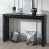 This modern black console table features a sleek ribbed-leg design and refined wood grain tabletop, bringing minimalist elegance to entryways, living rooms, or hallways. Crafted from high-quality manufactured wood, it offers sturdy, reliable support for décor, books, plants, or storage baskets. Its slim, space-saving profile fits perfectly in narrow spaces and apartments without overwhelming the room. Designed for versatile placement, it works beautifully as an entryway table, hallway console, or behind-the-sofa accent.