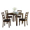 This 5-piece dining set features a transitional style that blends modern simplicity with classic elegance, bringing warmth and sophistication to any space. Designed with leatherette upholstery, the chairs offer a smooth, durable surface that’s easy to clean and maintain. Built with sturdy construction using solid wood and veneer, it ensures long-lasting stability for daily use. The chairs provide superior comfort with thick padded seats and ergonomic support for enjoyable dining experiences.