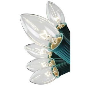 GE String-A-Long incandescent C-9 cool bright 25-count clear light set. Copper screw base, 7-watt, 1000 hour long life bulbs, 6-Inch lead wire, 8-inch lamp spacing, 6-inch end connector, 16-feet lighted length, green cord set with fused plug. Features: GE C-9 incandescent Christmas string lights. 25-Count, clear incandescent lights. 16-Feet lighted length, green cord with fused plug. Can connect up to 2 sets. Replacement fuse included for added convenience. For indoor or outdoor use