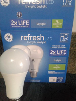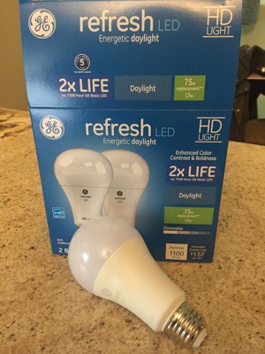 [This review was collected as part of a promotion.] I am very happy with the GE Refresh Daylight HD 75W replacement LED light bulbs. I use these in my ceiling light in my bathroom. It gives my bathroom a wonderful brightness. These bulbs can last up to 13 years. They also work with your dimmer switch. I like the idea of saving money because these bulbs only actually use 13 Watts per bulb. They have a frosted finish. You get two bulbs per package. I would recommend these light bulbs to everyone.