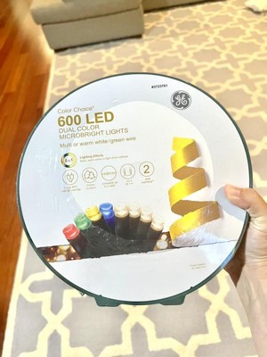 GE Color Choice LED MicroBright 600-count (2 sets of 300 lights each) color changing light set on storage reel. Use the control box to choose between multicolor, warm white, or light show settings. 36-Inch lead wire, 2.5-inch lamp spacing, 4-inch coaxial end connector, 125-feet lighted length, and green cord set. Features: GE LED MicroBright color changing Christmas string lights on a storage reel. 600-Count (2 sets of 300 lights each), Color Choice LED lights - use control box to choose between multicolor, warm white, or light show settings. 125-Feet total lighted length, green cord. Can connect up to 2 sets. For indoor or outdoor use.