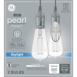 Elevate your décor with brilliance using GE Pearl Filament HD LED Daylight Light Bulbs. Designed to seamlessly blend into the background with classic charm of filament light bulbs with the efficiency and longevity of LED technology, Pearl Filament LED bulbs provide a timeless aesthetic of sophistication. Compared to standard yellow LED filaments that disrupt a fixture’s aesthetic, the subtle filament and clear glass beautifully accentuate decorative fixtures offering room light with a fresh bright daylight. Whether you’re looking to brighten your bedroom lights and work lights or add ambiance to a dining area - together with high-definition, comfortable lights, Pearl Filament lights elevate the charm of your lights when on or off. With a lifespan of up to 15,000 hours, our bulbs are built to last, reducing the hassle and cost of frequent replacements. These are also dimmable bulbs, allowing you to dim and customize the brightness to suit any occasion or mood. Our clear light bulbs are available in a variety of shapes and sizes to fit standard light fixtures with an E26 medium base or an E12 small candelabra base. Upgrade your room décor today with the perfect balance of elegant charm and efficiency with GE Pearl Filament HD LED Light Bulbs.