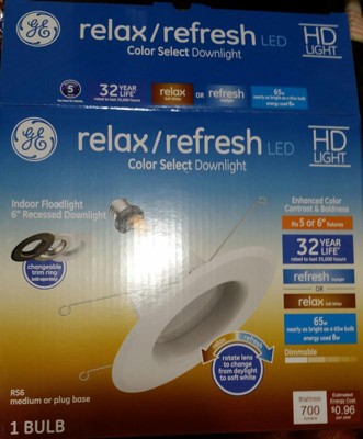 [This review was collected as part of a promotion.] GE relax / refresh color select 65w 6 inch recessed light is very bright and it has two different settings for brightness first setting is soft and second setting is daylight. It is very easy to install. I have mine set on daylight which is 4000k. It is very well built