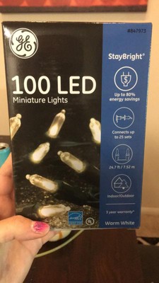 GE StayBright LED 5.5mm traditional miniature 300-count (2 sets of 150 lights each) warm white light set on storage reel. Each set has 3-Inch lead wire, 3-inch bulb spacing, 3-inch end connector plug. 74.4-Feet total lighted length, and green cord set with fused plug. Features: GE 5.5mm LED Christmas string lights on a storage reel. 300-Count (2 sets of 150 lights each), warm white StayBright LED lights. For indoor or outdoor use.