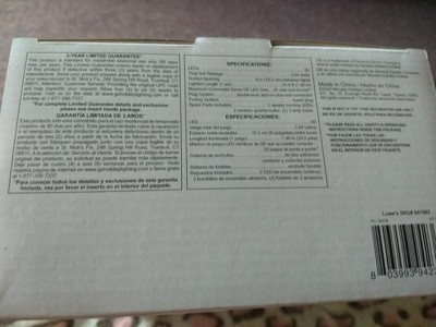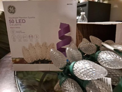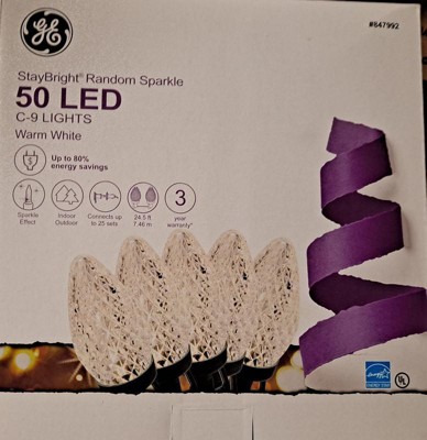 The GE StayBright Random Sparkle LED C9 50-count warm white light set is perfect for the holiday season, a wedding, or other holiday. This light string has a 6-Inch lead wire, 6-inch lamp spacing, 6-inch end connector plug to hang on your mantle, porch or outdoor space. Features: GE C9 LED Christmas string lights. 50-Count, warm white random sparkle LED lights. 24.5-Feet lighted length, green cord with fused plug. Can connect up to 25 sets. Replacement bulbs and fuses included for added convenience. For indoor or outdoor use.