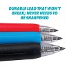 - Retractable mechanical pencil with no eraser — available in blue, red, and black.