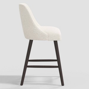 A: The barstool features sheepskin-look fabric upholstery in a light natural hue for a soft feel.