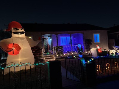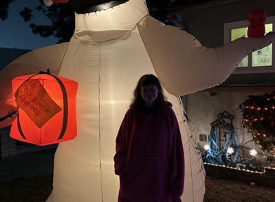 At 10.5 feet tall, this inflatable doesn’t seem very big—until it’s standing in your yard! It’s massive but easy to set up. However, it’s best to have a second person hold it upright while you secure it to the ground, as it’s prone to tipping over otherwise. There are two drawbacks worth mentioning: 1. The second arm, which holds dice (not visible in the advertisement), does not light up. This makes the dice hard to see at night. 2. The name tag also doesn’t light up, and its color is too similar to the present it’s attached to, making the names hard to read. That said, I got it for a decent price, so I can’t complain too much. To show its size, I had my 5’6” niece stand in front of it for comparison.