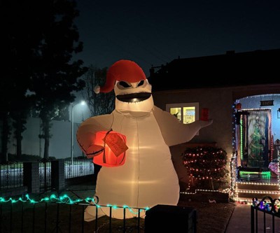 Well, well, well. What have we here? A giant Airblown® Inflatable Oogie Boogie! This 10.5-ft Christmas inflatable features Oogie Boogie decked in a Santa hat and holding a wrapped gift for Lock, Shock and Barrel. It makes an eye-catching addition to your outdoor Christmas decorations. Setup is super simple. Just plug it in, stake it down and watch the magic unfold. Display this Nightmare Before Christmas holiday inflatable as a standalone or combine it with other Airblown Inflatables to create a custom scene.